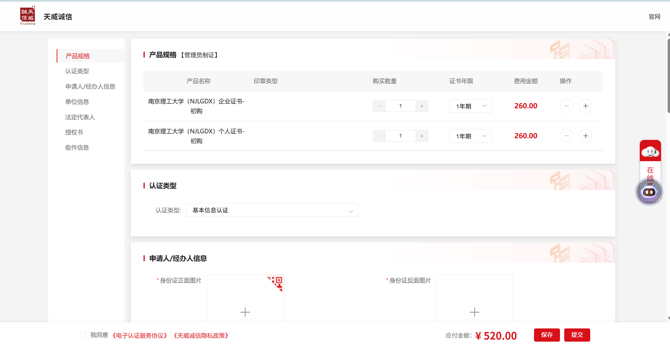 企业证书+个人证书在线办理方式:https://www.itruscloud.com/certsaas_cloud_portal/#/createOrder?productCode=CERT718094,CERT137003注:初次办理证书请办理一套(企业证书+法人证书)