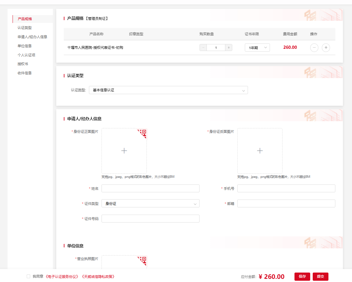 授权人代表证书在线办理方式:https://www.itruscloud.com/certsaas_cloud_portal/#/createOrder?productCode=CERT481552,请按照页面要求完整填写,其中“*”均为必填项。如下图: