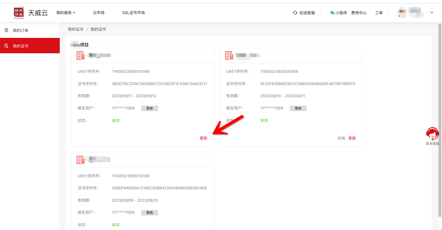 用购买证书的手机号码或者证书登录网址:https://www.itruscloud.com/home/#/signMountApp/login?appCode=ycd登录平台后点击【工作台】——【云采盾】——【我的证书】,找到需要更新的证书,点【更新】提交更新的订单; 审核通过后,请在订单页面,点“更新”按钮更新下载证书即可,请您随时关注您的订单状态。